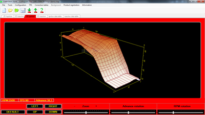 Einspritzung: Wie bei der Zündung können durch ein einfaches Drag-an-Drop einzelne Einspritzmengen oder die ganze Kurve im Diagramm in kleinen Inkrementen verschoben werden. Einzelwerte im Diagramm können anlog zur Zündung in einer Tabelle als Zahlenwert verändert werden. Jedes Diagramm verfügt über 32 Punkte für den Drehzahlbereich die mit unterschiedlichen Werten für Einspritzdauer programmiert werden können. Zwischen den Punkten wird interpoliert und Veränderungen können in Schritten von 0,1 Millisekunden Einspritzdauer durchgeführt werden. Es steht ebenfalls ein 3D-Modus zur Gesamtansicht der Einspritzparameter über alle 16 Drosselklappenpositionen zur Verfügung. Die Korrekturtabellen für Motorkaltstart, Motorheißstart, Beschleunigerpumpe, Batteriespannung, Umgebungsluftdruck, Lufttemperatur und Motorkühl-wassertemperatur sind vorhanden und können programmiert werden.